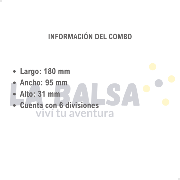 Práctica, compacta y funcional, ideal para mantener organizados tus accesorios de pesca, como anzuelos, esmerillones, plomitos, etc.