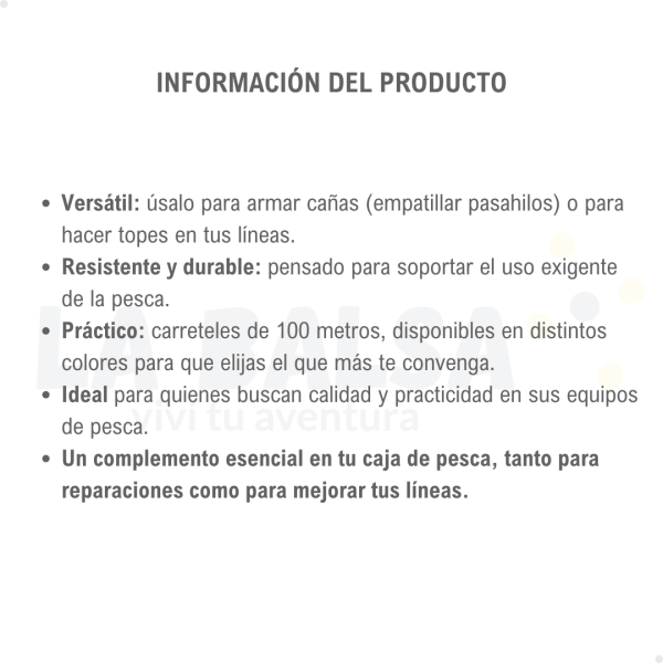 • Práctico: carreteles de 100 metros, disponibles en distintos colores para que elijas el que más te convenga.