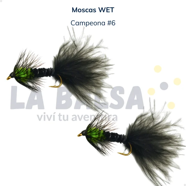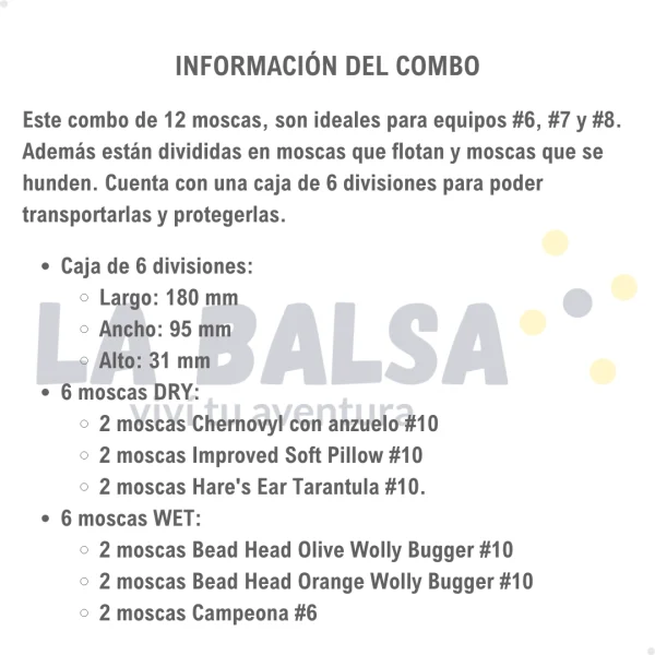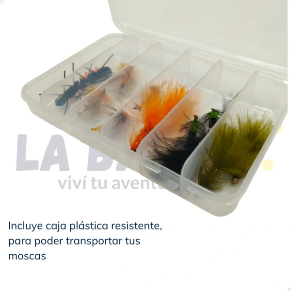 Este combo de 12 moscas, son ideales para equipos #6, #7 y #8. Además están divididas en moscas que flotan y moscas que se hunden. Cuenta con una caja de 6 divisiones para poder transportarlas y protegerlas.