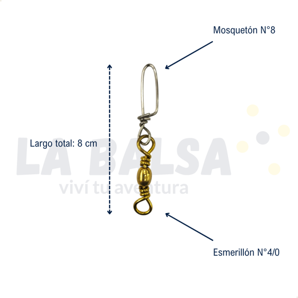 Diseñado para ofrecerte la máxima resistencia y durabilidad en tus aventuras de pesca. Con un diseño robusto y confiable, este accesorio es ideal para todo tipo de líneas de pesca y te garantiza un enganche y liberación fáciles y rápidos. Ya sea que pesques en agua dulce o salada, este mosquetón con esmerillón asegura una conexión segura entre el anzuelo, señuelo o cualquier otro equipo.