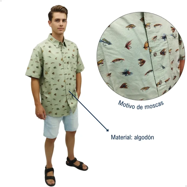 Expresa tu pasión por la pesca con mosca con esta camisa de manga corta, diseñada para destacar tanto en la ciudad como en escapadas al aire libre. Su estampado detallado de moscas de fly fishing aporta un estilo auténtico y original, ideal para quienes viven la pesca como un estilo de vida.
