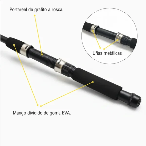 La caña está fabricada en fibra de vidrio, lo que le otorga una alta resistencia y durabilidad frente a los rigores de las condiciones de pesca. Su mango recubierto de EVA es ergonómico, antideslizante y garantiza un agarre cómodo durante largas horas de uso. El portareel a rosca proporciona un ajuste seguro, asegurando que tu carrete esté siempre en su lugar. Esta caña es capaz de soportar plomadas de hasta 30 gramos, lo que la hace adecuada para diversas técnicas de pesca. Con un diseño compacto y portátil, se pliega a tan solo 41 cm, lo que facilita su transporte y almacenamiento.
