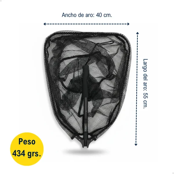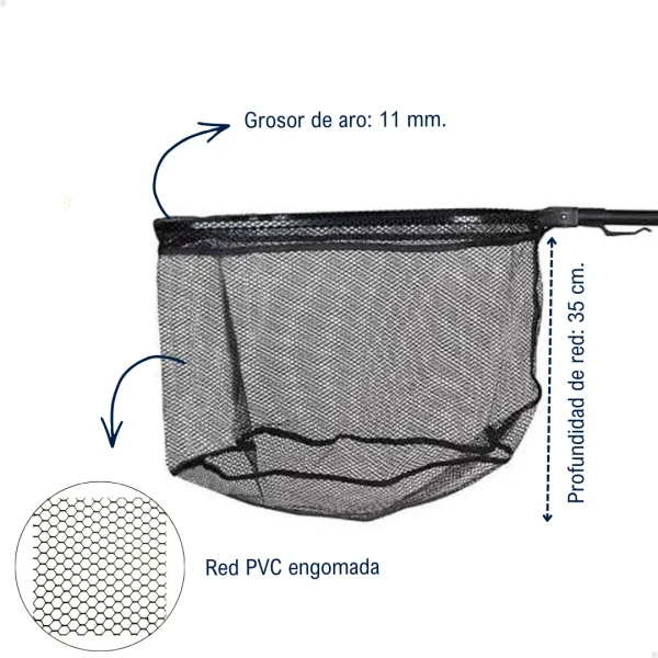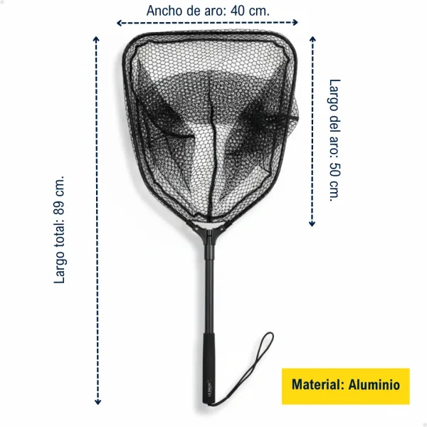 Su estructura de aluminio anodizado brinda excelente durabilidad y resistencia a la corrosión, mientras que su red de PVC engomada protege al pez, siendo perfecta para pesca con devolución.