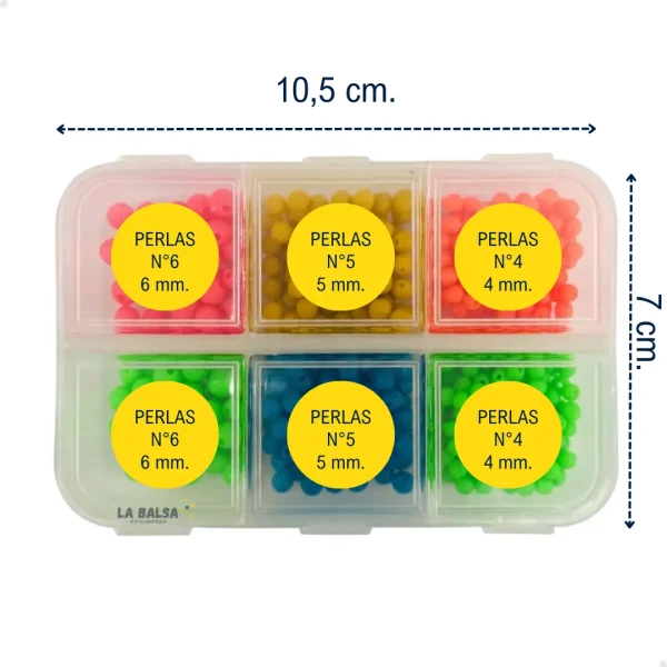 Kit Combo Perlas Plástica para armado de líneas, presentado en una práctica caja organizadora con 6 divisiones. Ideal para mantener ordenados los distintos tamaños y agilizar el armado con precisión.
