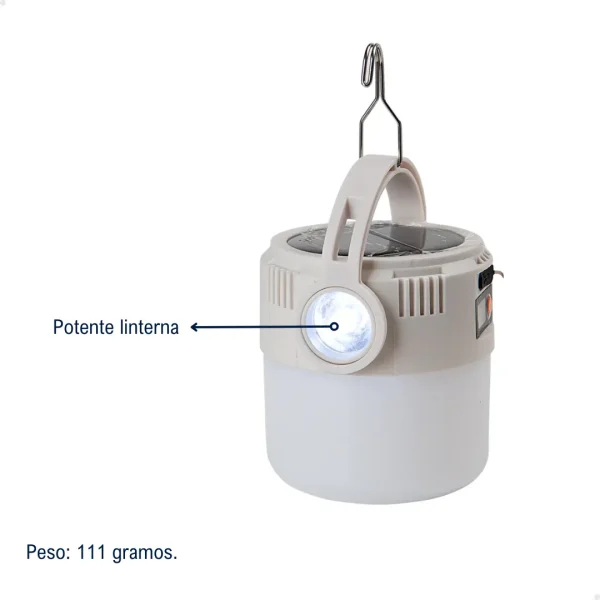 Este farol portátil está equipado con dos potentes LED de 200 lúmenes y ofrece diversas funciones de luz principal y auxiliar, incluyendo modos brillante, tenue e intermitente. Su alcance de hasta 20 metros garantiza una cobertura óptima, mientras que la pantalla digital integrada permite un control claro del estado y funcionamiento del dispositivo. Además, incorpora un práctico gancho que facilita su transporte y colocación.