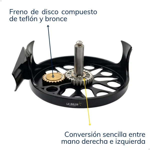 - Freno de disco compuesto de teflón y bronce, que ofrece un desempeño suave y confiable.