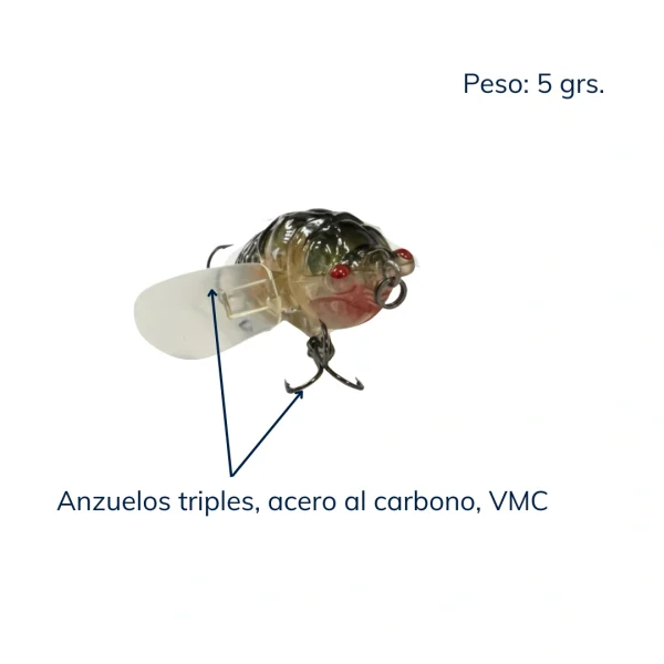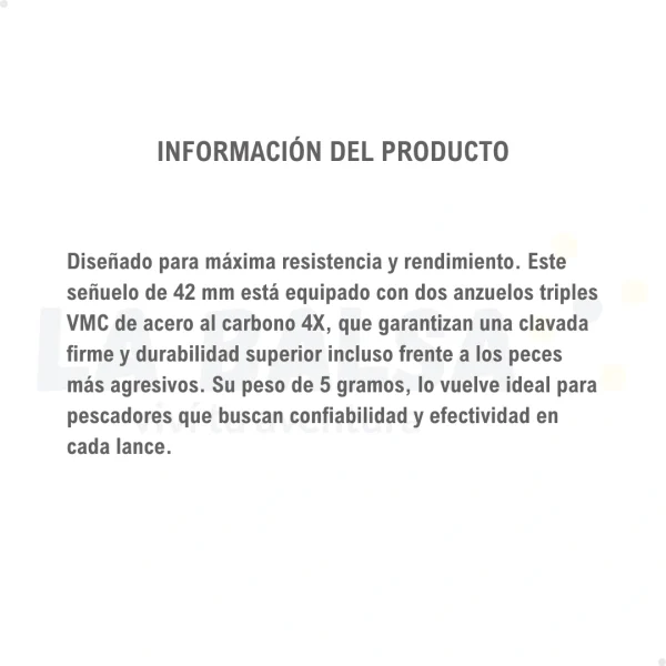 Diseñado para máxima resistencia y rendimiento. Este señuelo de 42 mm. está equipado con dos anzuelos triples VMC de acero al carbono 4X, que garantizan una clavada firme y durabilidad superior incluso frente a los peces más agresivos. Su peso de 5 gramos, lo vuelve ideal para pescadores que buscan confiabilidad y efectividad en cada lance.