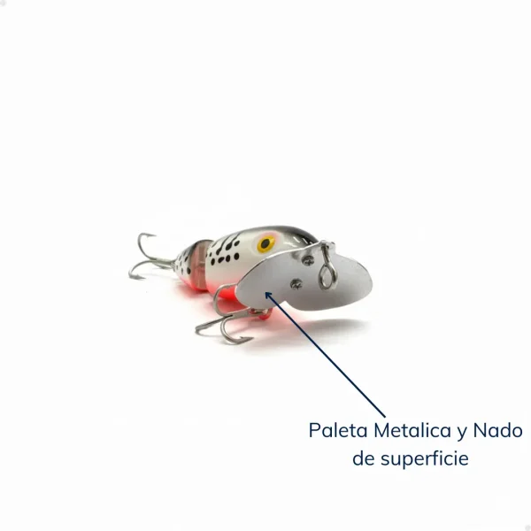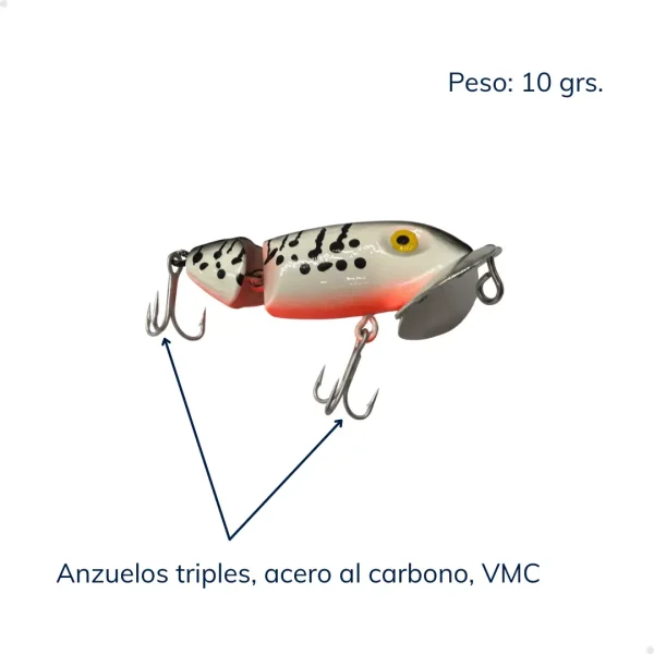 Diseñado para máxima resistencia y rendimiento. Este señuelo de 70mm está equipado con dos anzuelos triples VMC de acero al carbono 4X, que garantizan una clavada firme y durabilidad superior incluso frente a los peces más agresivos. Su peso de 10 gramos, lo vuelve ideal para pescadores que buscan confiabilidad y efectividad en cada lance.
